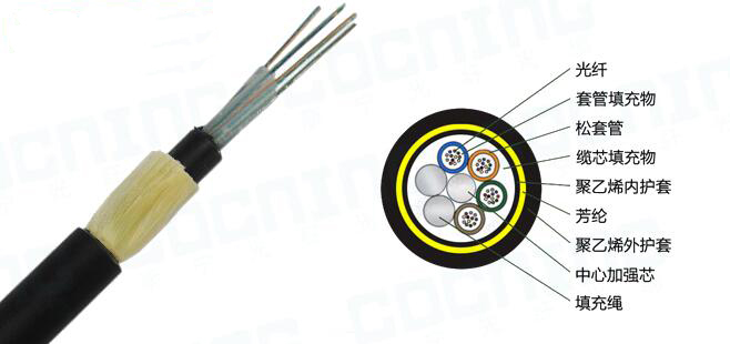 ADSS光缆也称全介质自承式光缆,全介质即光缆所用的是全介质材料,自承式是指光缆自身加强构件能承受自重及外界负荷。ADSS光缆采用松套层绞式结构,将250um光纤套入高模量材料制成的松套管中,松套管内填充特种防水化合物。松套管围绕非金属加强件(FRP)绞合成紧凑的缆芯,缆芯的缝隙充以阻水油膏。缆芯外挤制聚乙烯内护套,然后绞绕起加强作用的芳纶,最后挤制聚乙烯外护套或耐电痕外护套成缆。